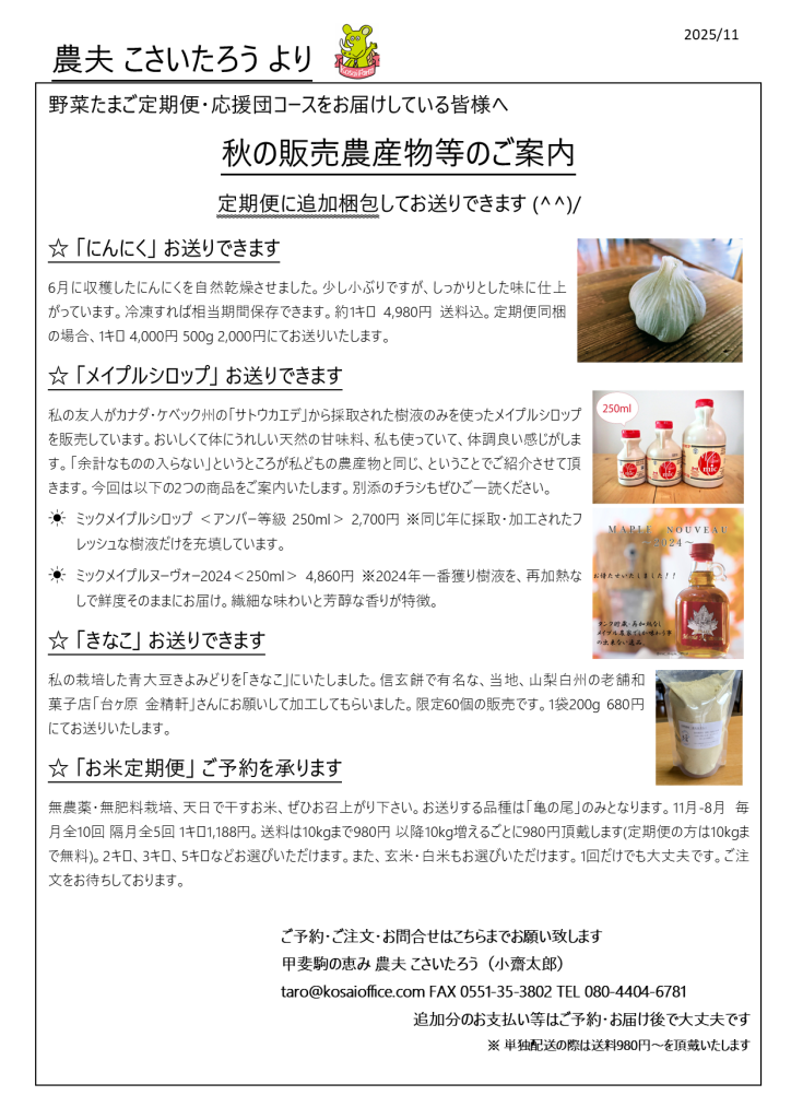 2025 秋の販売農産物等のご案内 2025.10.25 未分類 Tweet 関連記事 田植えの服装 202510 定期便に同梱可能な商品ご案内 お詫び(2022/01/26) 2024年 援農のお願い予定表 農夫 こさいたろう だより 25/06