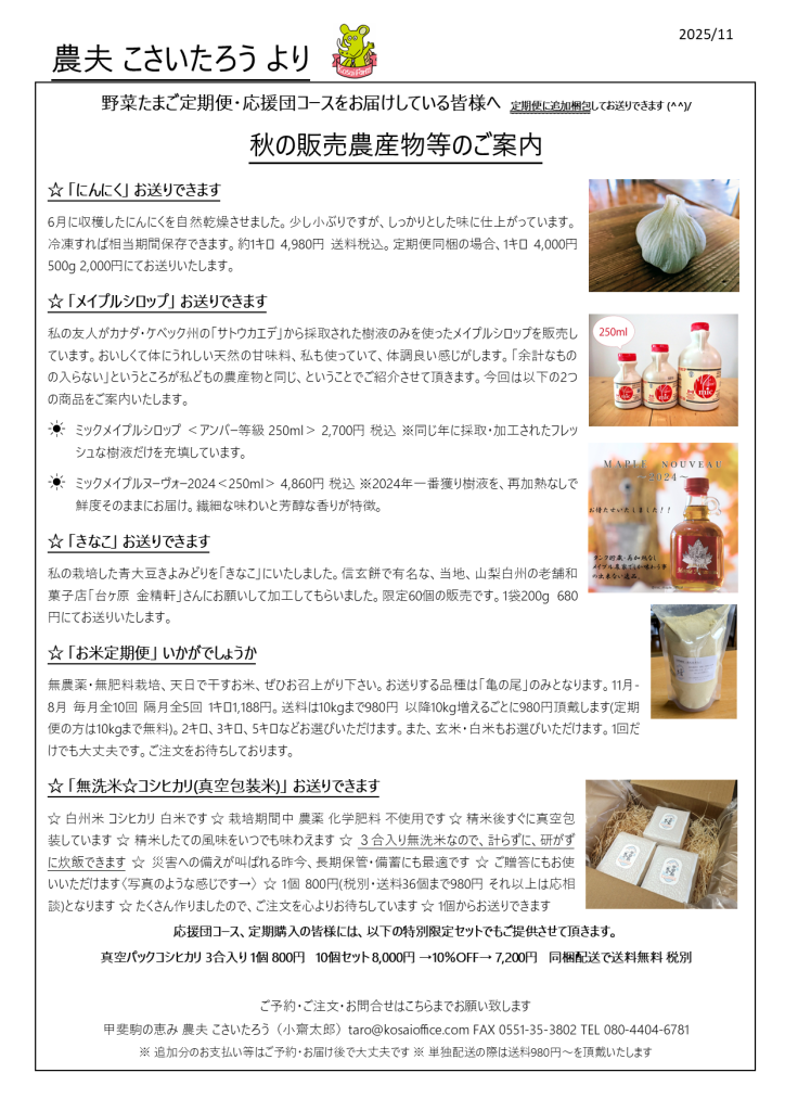 2025.11 晩秋の販売農産物等のご案内 2025.11.02 未分類 Tweet 関連記事 農夫 こさいたろう だより 25/06 202510 定期便に同梱可能な商品ご案内 2024年 援農のお願い予定表 2025 秋の販売農産物等のご案内 田植えの服装 お詫び(2022/01/26)
